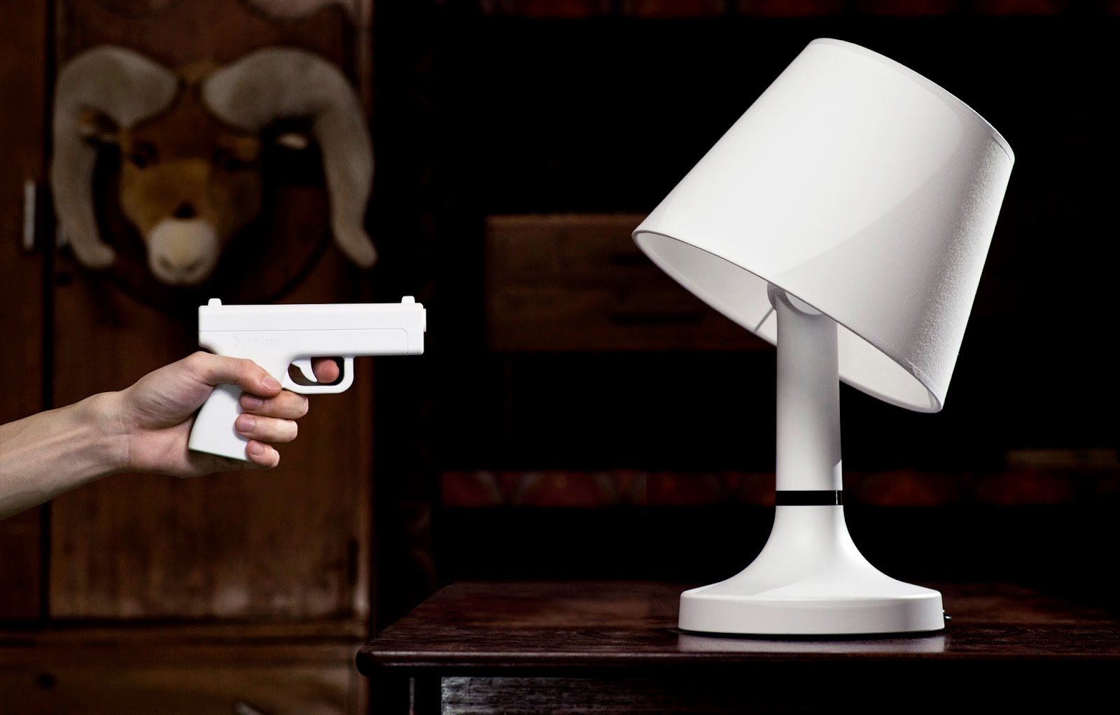 La lampe BANG! est livrée avec son petit pistolet particulier qui fait office de télécommande (si vous sortez le magnum que mamie cache sous son oreiller, on ne garantie pas qu'elle se rallume un jour).