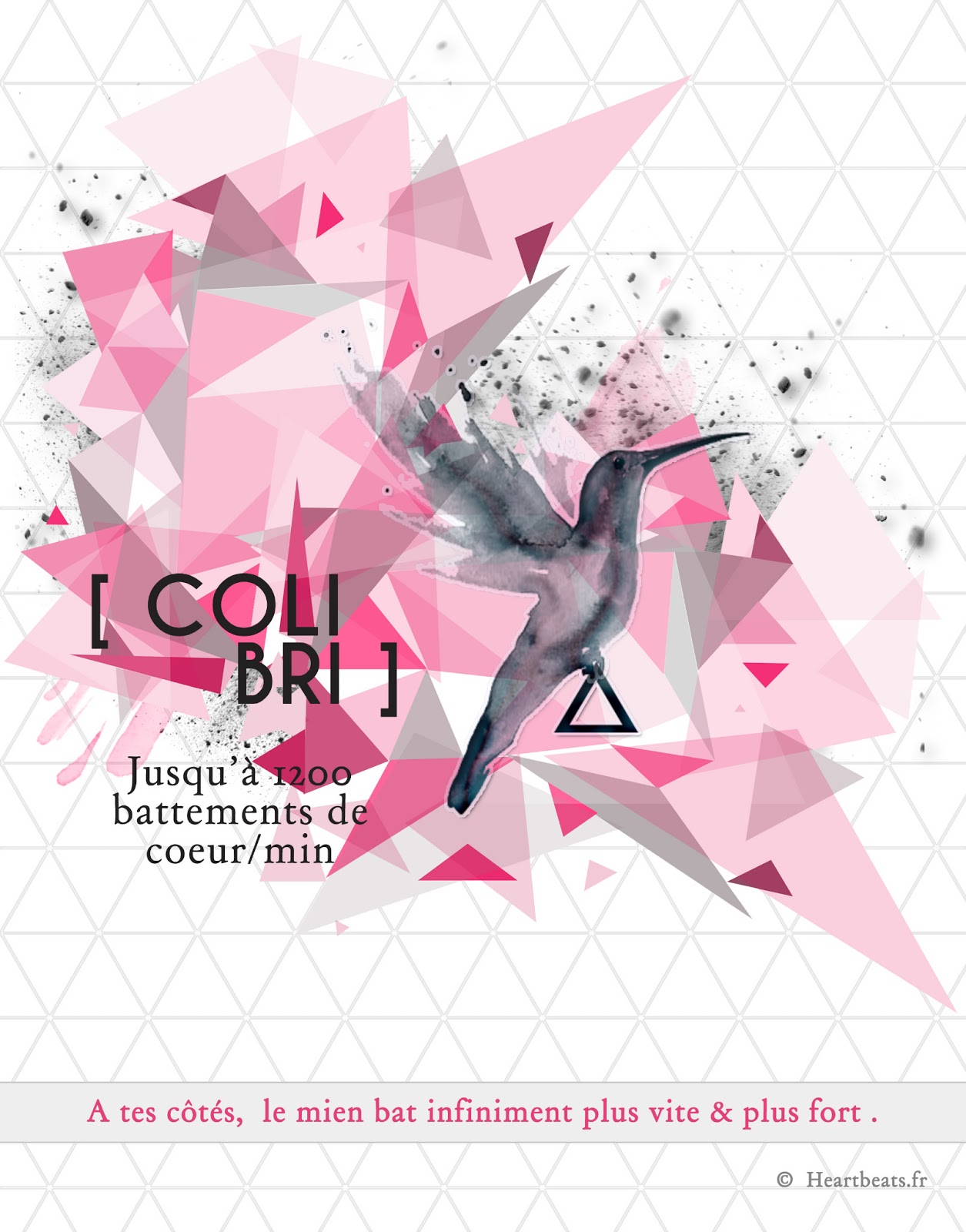 Nous vous avons réalisé une carte très originale sans cupidon, sans petit cœur dégoulinant sur le thème des palpitations. Elle a pour personnage principal un colibri qui, connu pour être l'animal dont le cœur bat le plus vite, incarne la fragilité car quand on donne son petit cœur à quelqu'un on prend forcement le risque qu'il nous le rende un jour tout cassé. S'abandonner, se rendre vulnérable et faire confiance à l'être que nous chérissons n'est-ce pas une belle preuve d'amour ?