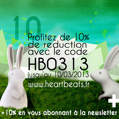 Ce bon de réduction est utilisable une seule fois par compte client et cumulable avec les autres réductions et promotions en cours ( dont les 10% de réduction en vous abonnant à la newsletter) . Il est valable jusqu'au 10/03/2013 sur tout le site www.heartbeats.fr . N’hésitez pas à le partager !