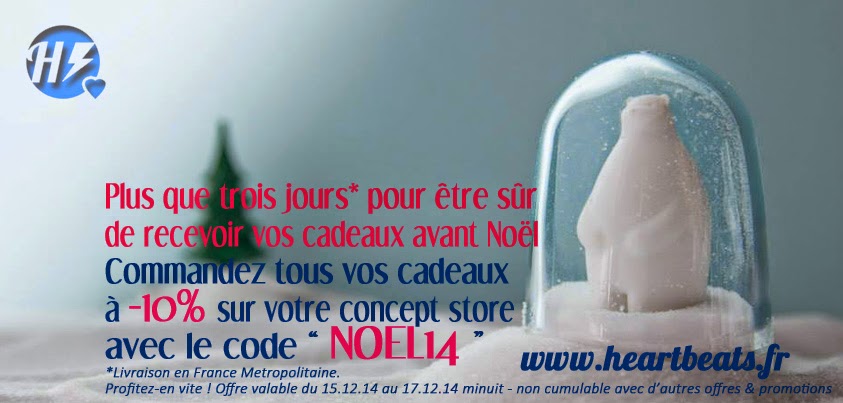 pourront en bénéficier. Pour profiter de cette offre, il suffit de rentrer le code NOEL14 dans la page panier (cette offre est non cumulable avec d'autres reductions et promotions). Nous esperons qu'elle vous permettra de combler de joie (et de cadeaux originaux) vos proches pour Noël à petits prix !Vous pouvez également créer votre Wishlist et transmettre ce code de réduction à vos proches. Besoin d'inspiration ? Découvrez notre sélection d'idées cadeaux de Noël en parcourant l'atelier des écureuils, cliquez iciSinon, rendez-vous directement sur www.heartbeats.fr
